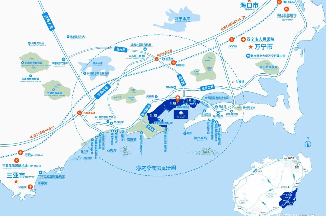 项目与高铁神州站直线公里即达海南环岛高速神州半岛匝道出入口,约10公里即达兴梅大道,轻松环游全岛。往北约53公里即达琼海博鳌机场,乘高铁5站即达三亚凤凰机场(约110km)、4站即达海口美兰机场(约150km),全国主要城市航班直飞。