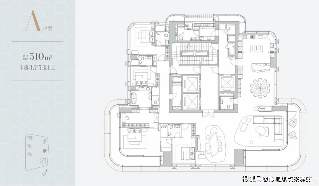 510㎡4房5卫:位于A栋(43F),层高3.6米,3T1,目前深圳还没有这个面积段的二手大平层住宅,直接对标澐玺的500㎡。