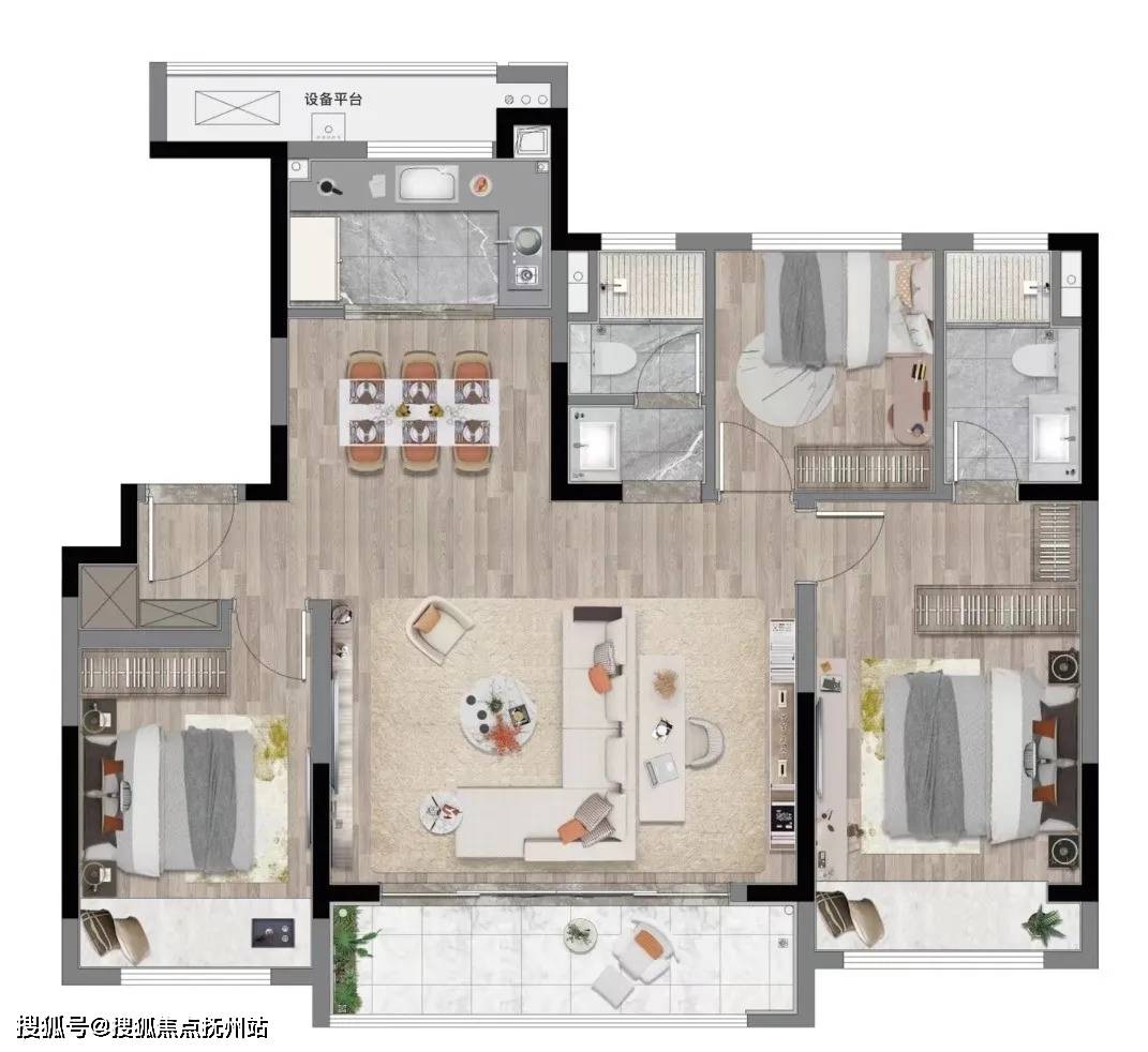 建面约118㎡三房两厅两卫的户型,将原本应该是140㎡豪宅元素全部放入其中,简直是一次空间格局降维打击。