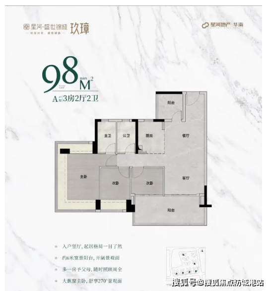 98㎡户型为全新升级户型,主朝向朝南,让阳光洒满每一个角落;主卧配备270°无柱飘窗,视野开阔,美景尽收眼底;次卧和阳台尺度大幅增加,提供更加舒适的居住体验,无论是休闲娱乐还是晾晒衣物都更加从容,适合刚需小家庭居住。