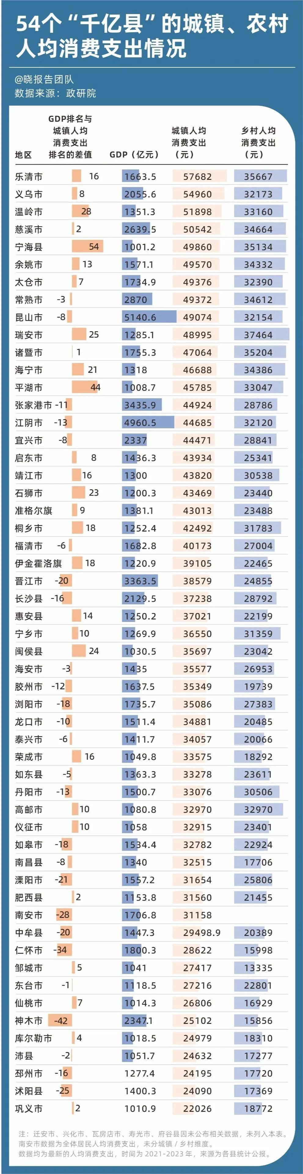 而这些高收入县域,根据《54个“千亿县”的城镇、农村人均消费支出情况》,其消费特征又呈现出四种鲜明“性格”: